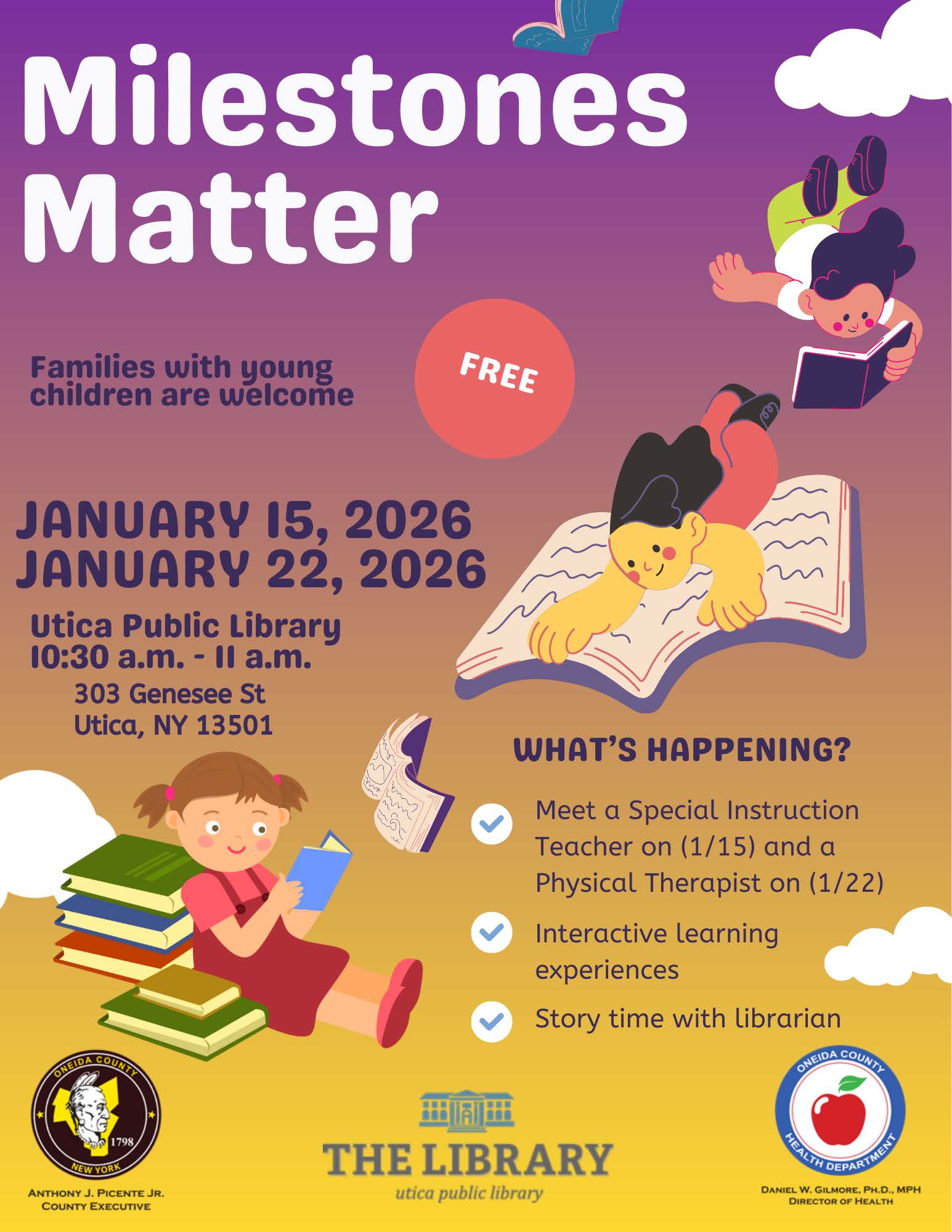 Join us for the Milestones Matter event: Oneida County Health Department Special Children Services program is partnering with Utica Public Library to host hands on activities and learning for young children and families. Specialists will be on hand for educational activities and learning. Sessions are offered each month and are free.