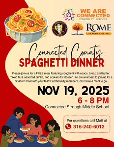 The Connected Initiative, in collaboration with Oneida County Dept. of Social Services and the Connected Rome Central School District, is hosting "Connected County Spaghetti Dinner."