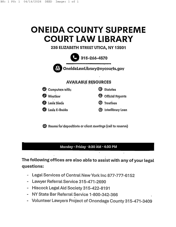 The Oneida County Clerk is the recorder of land records and the clerk for Supreme Court. While we can answer recording FEE questions, we can not answer many of your legal questions. We have provided several options below to help with legal inquiries: