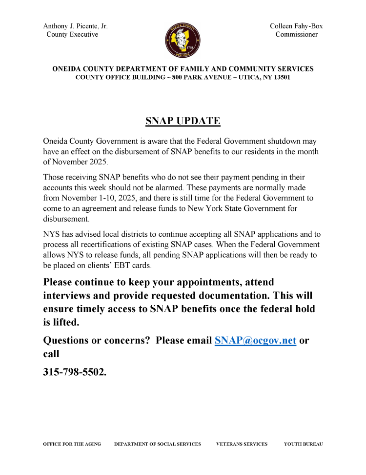 Applications can be Submitted Online and phone interviews can be given. Questions can be asked at SNAP@oneidacountyny.gov or call the hotline at 315-798-5502.